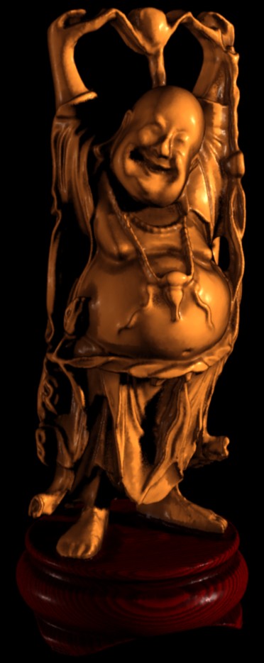 From the given perspective, there is not a lot to see or understand. Now, if you haven’t already, try zooming out using your mouse wheel (or fingers). As you might notice, a distinctive shape emerges, namely that of the Happy Buddha from The Stanford 3D Scanning Repository, where the color of each point encodes the distance from the viewer (depth). Here is an image of it from the front: