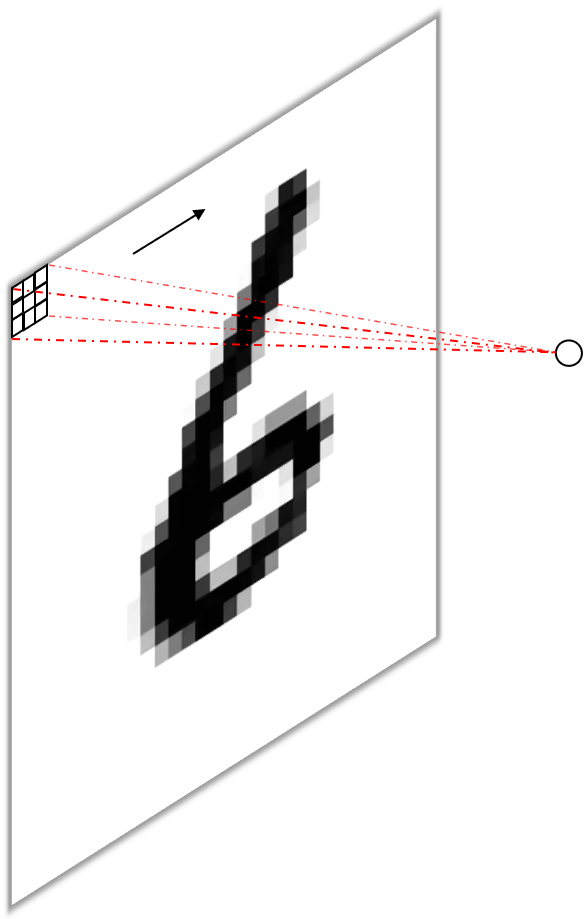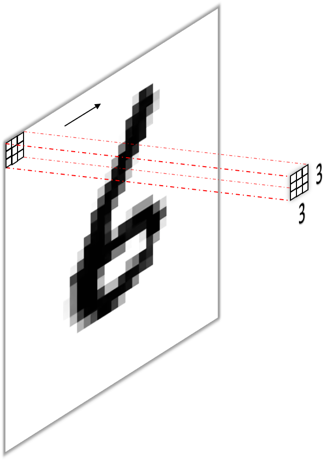 A standard convolutional layer is defined by the number of input channels, e.g. the red, green and blue color channels of an image for the input layer, the height and width of the kernels or weight matrices (we have one kernel per input channel) which are convolved with the input channels to give the convolutional neural network its name, and the number of output channels, or feature maps, or filters. A convolutional layer operating on an RGB image with $3\times3$ kernels and 128 filters would therefore be of dimension input channelxkernel heightxkernel widthxoutput channel i.e. $3\times3\times3\times128$. The first dimension is usually omitted, as it is deemed obvious (i.e. easily inferred from the number of channels from the input) and the output channel are sometimes stated in the first (“channels first”) or last (“channels last”) position. Below (figure 2) you see a simple convolution on a monochrome (black and white) input image (a) and the conceptually easy to imagine implementation using a “sliding fully connected” network (b).