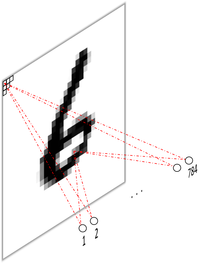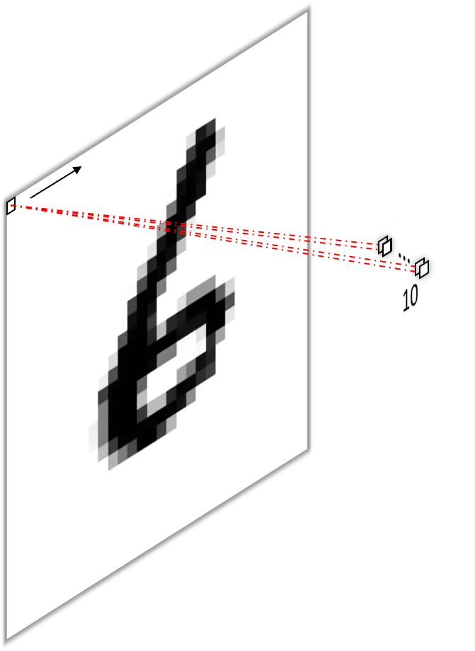 Armed with the knowledge from the previous paragraph, we can now understand the second approach of transforming a fully connected layer into a convolutional layer. To do so, we first transform the image into a vector4 by concatenating all of its pixels and then apply one filter per pixel with one kernel per pixel, as our image now has as many channels as it had pixels (i.e. it is of shape $1\times1\times784$). Have a look at figure 6 below to take it in visually.