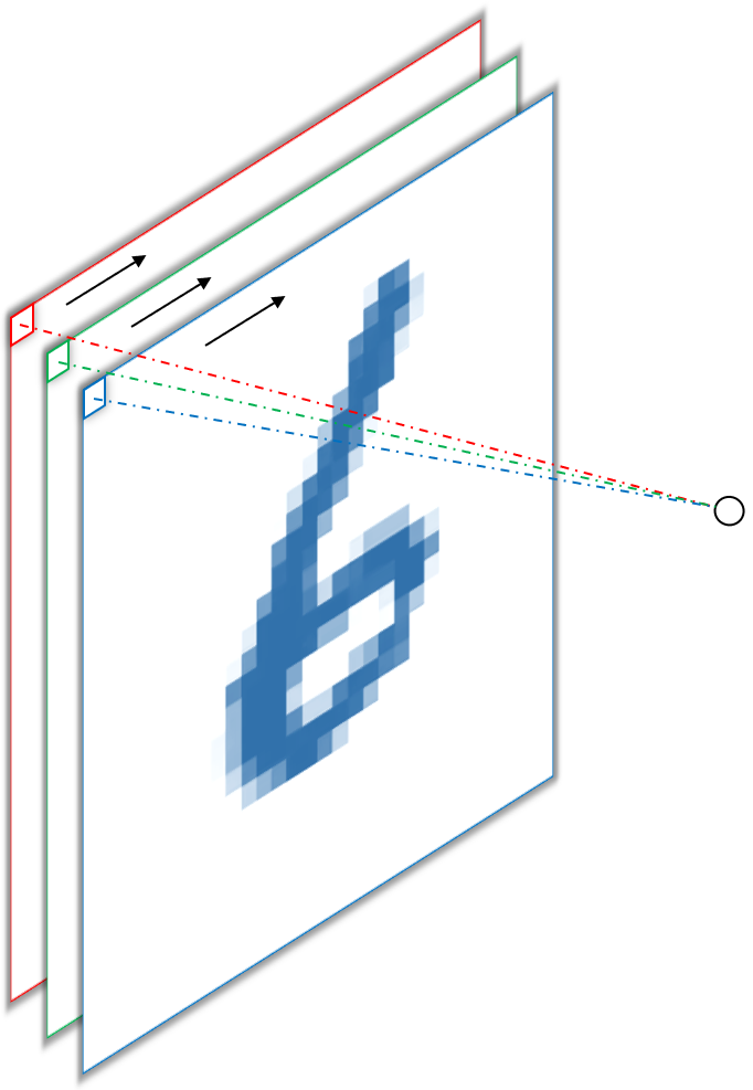 The important thing to note here is, that both approaches produce a single output per spatial dimension (i.e. width and height), because, per convention2, convolutions of input channels and kernels from the same filter are summed up, meaning each filter only produces one feature map. In the example above, the red, green and blue pixel values are multiplied by the red green and blue weights and then summed to give a scalar output. This is actually the more common way to employ $1\times1$ convolutions, namely as a way to reduce or increase depth, i.e. the number of output channels and not to mimic fully connected operations. For example, we can put this to use in the final layer of our network to produce one feature map per class by sliding $10$ filter with $1\times1$ kernels over the output feature maps of the previous layer. In the figure below (6), this would produce one feature map for each digit from one to ten, where each “pixel” in the feature map corresponds to the “oneishness” or “twoishness” of each input pixel3.
