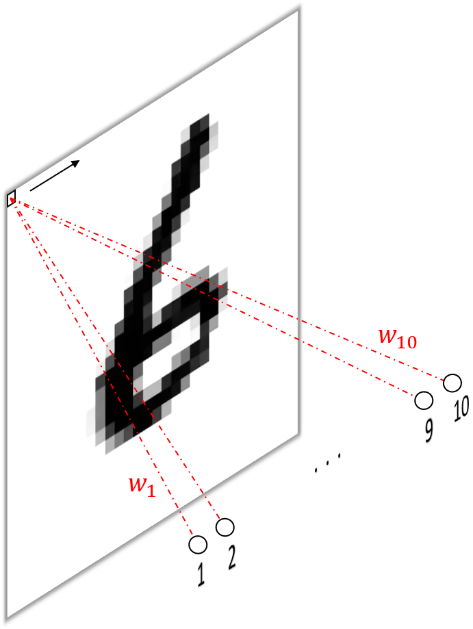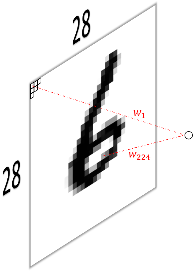 \[y=\sum_{i=1}^{784}w_ix_i+b,\]where $b$ is an offset, usually called the bias (not shown in the figure). This means we obtain $784$ scalar outputs $y$ from the layer, one from each unit.
