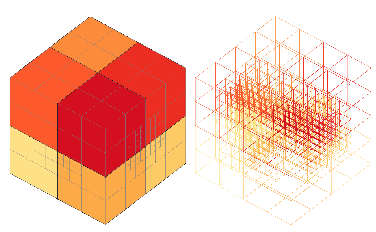 In our case, information can be a point from a point cloud or a face, vertex or edge from a mesh. This allows us to encode empty space by a few large voxels while occupied space is encoded by ever finer voxels, depending on the level of detail present at that particular position. Take a look at the example below.
