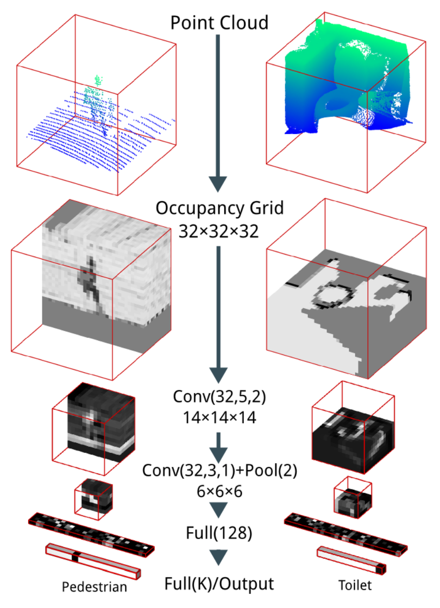 In this section, we will see how voxel grids have been used in the literature and how research has tried to make them more well behaved. Let’s start with the pioneering approach: VoxNet10.